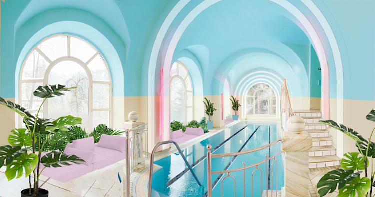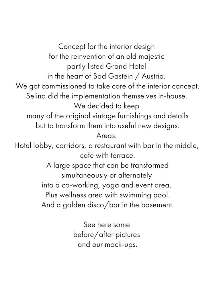 Interior concept for a reinvention of a old majestic Grand Hotel in the heart of Bad Gastein / Austria. The Moods were very well received, so we got commissioned to take care of the interior concept as well. Selina did the implementation themselves in-house. We decided to keep a lot of the original vintage furniture and details. And also to customize them into useful new designs. Areas: Hotel lobby, corridors, a restaurant with bar in the middle, cafe with terrace. A large room that could be transformed into a co-working, yoga and event area at the same time or alternately. Plus wellness area with swimming pool. And a golden disco / bar in the basement.